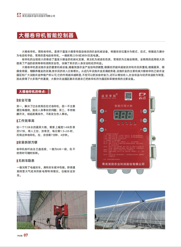 壽光龍?zhí)镛r(nóng)業(yè)科技股份有限公司于2014年創(chuàng)立于“蔬菜之鄉(xiāng)”----山東壽光。公司立志用科技服務(wù)三農(nóng),以幫助農(nóng)業(yè)企業(yè)和個(gè)人提高農(nóng)業(yè)生產(chǎn)率,協(xié)助農(nóng)業(yè)企業(yè)和個(gè)人生產(chǎn)健康安全的高品質(zhì)農(nóng)產(chǎn)品為使命。踐行“自強(qiáng)不息,厚德載物”的企業(yè)理念,專注于設(shè)施農(nóng)業(yè)裝備研發(fā),研發(fā)生產(chǎn)了“溫室智腦”智慧農(nóng)業(yè)物聯(lián)網(wǎng)系統(tǒng)、大棚智能放風(fēng)機(jī),“龍?zhí)ь^”大棚運(yùn)輸車,“春暖花開(kāi)”紅外反射大棚保溫被,大棚卷簾機(jī)等系列產(chǎn)品。公司于2017年在齊魯股權(quán)交易中心掛牌上市,股票代碼302505。 公司擁有注冊(cè)商標(biāo)12個(gè),實(shí)用新型專利18項(xiàng),外觀專利4項(xiàng),并獲得了ISO9001質(zhì)量管理體系認(rèn)證證書,2021-2023年科技型中小企業(yè)稱號(hào)。溫室智腦大棚放風(fēng)機(jī),獲得2020年度農(nóng)業(yè)農(nóng)村部舉辦的創(chuàng)新比賽優(yōu)秀獎(jiǎng)。 2022年,中央網(wǎng)信辦、農(nóng)業(yè)農(nóng)村部、國(guó)家發(fā)展改革委、工業(yè)和信息化部、國(guó)家鄉(xiāng)村振興局聯(lián)合印發(fā)的《2022年數(shù)字鄉(xiāng)村發(fā)展工作要點(diǎn)》又進(jìn)一步細(xì)化了智慧農(nóng)業(yè)在2022年的重點(diǎn)任務(wù),龍?zhí)镛r(nóng)科將抓住歷史機(jī)遇,打造智能化的系列裝備,讓農(nóng)業(yè)生產(chǎn)更高效,更智能。
